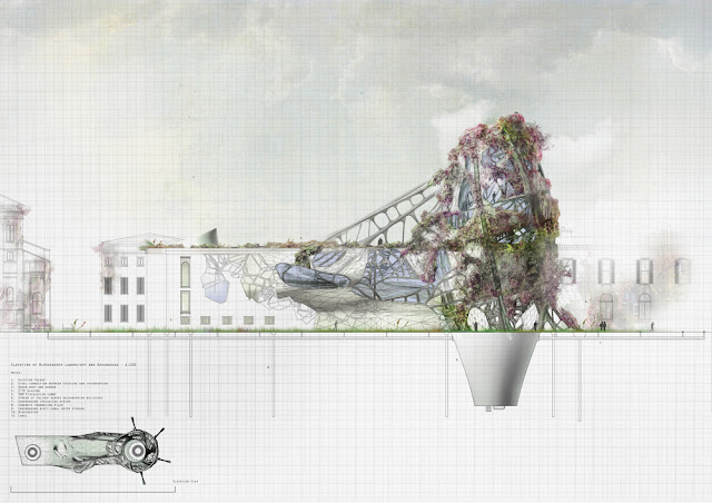 This project proposes a Bioresearch Laboratory for the engineering of resilient, colourful plant life that will transform the currently grey San Marco District into a thriving garden. Along with a laboratory, this intervention will provide a hydroponic greenhouse tower, giving the structure and nutrients required for new plants to thrive.